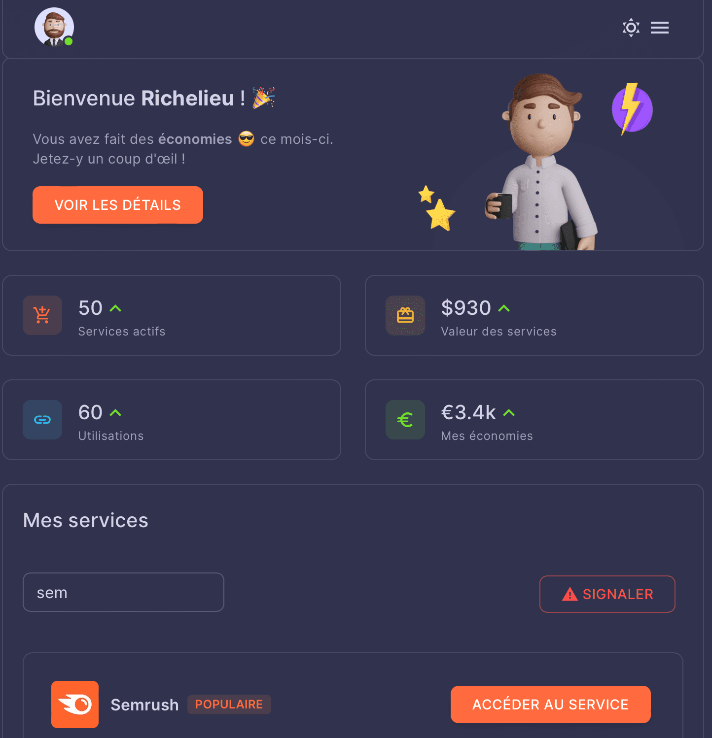 Plateforme SaaS sur abonnement offrant un accès centralisé à une variété d'outils en ligne pour l'optimisation SEO, l'analyse de marché et le design.